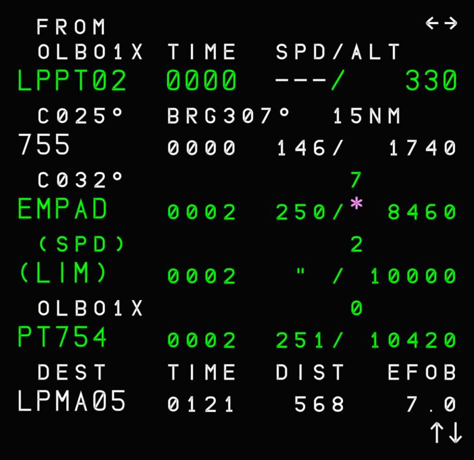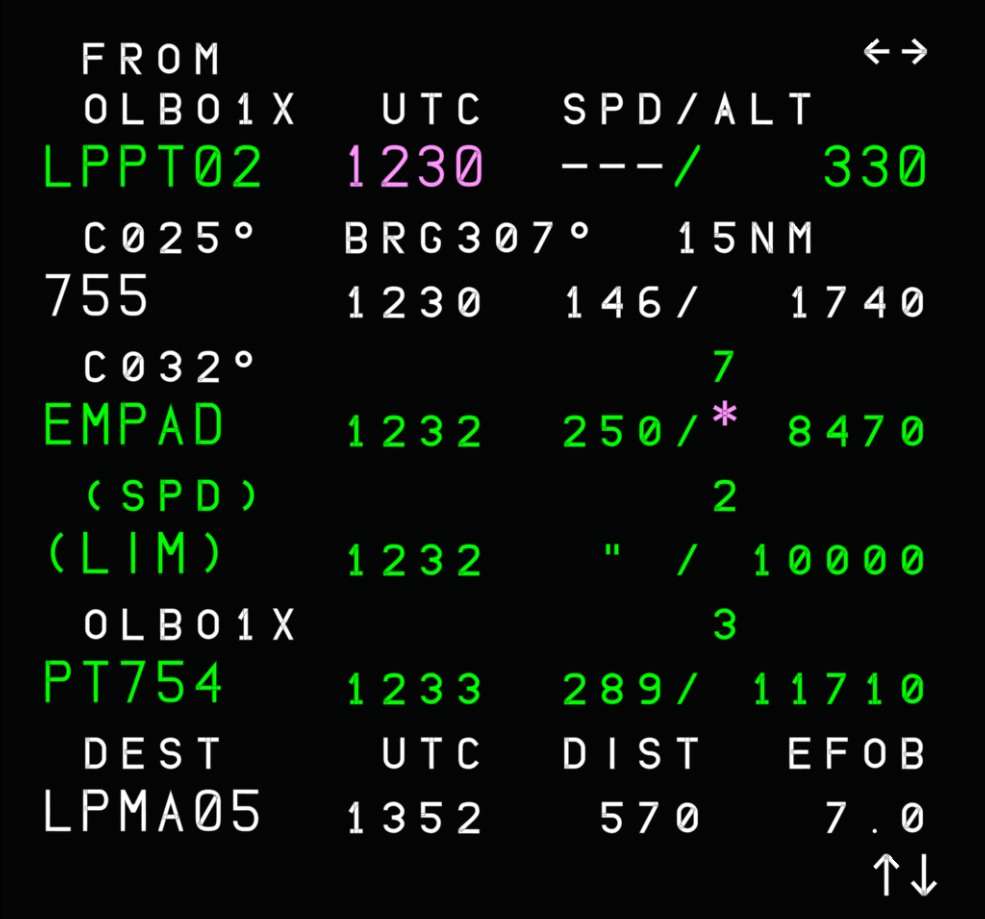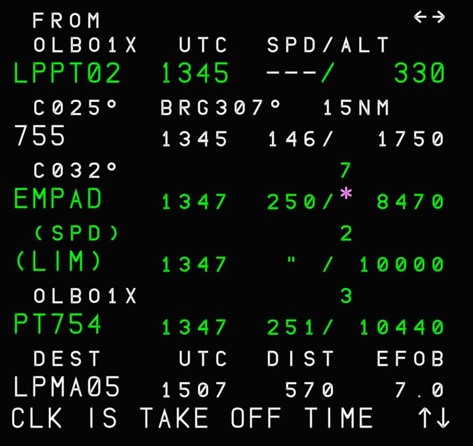 If we now go back to the F-PLN page, we can notice that our ETT is shown in magenta at the departure airport and the time predictions are relative to 12:30Z. While before we had flight times shown, now we have the expected time of arrival at each waypoint.