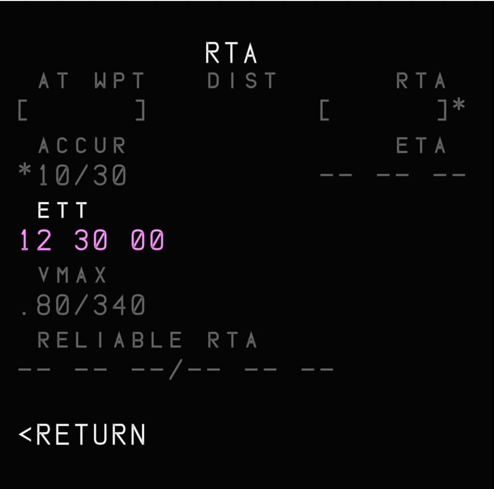 On this page, we can find the ETT prompt at LSK 3L, where we can add our ETT. The ETT can be inserted in HMM, HHMM, HHMMS, or HHMMSS format. Any entry that does not follow these rules will result in a "FORMAT ERROR". Here, we will insert 1230 and upon doing so, the ETT is accepted and shown in magenta.