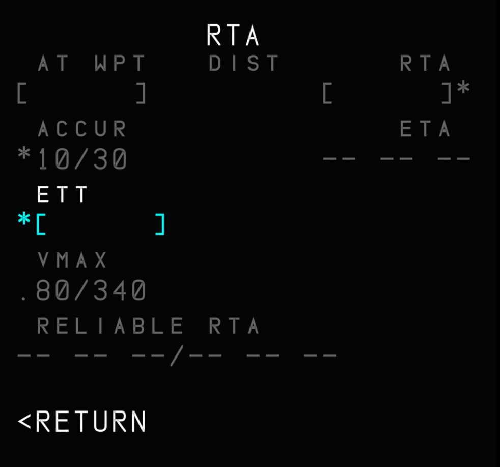 The A32NX supports the insertion of an ETT on the MCDU. This time is used to initialize FMGS time predictions during preflight.