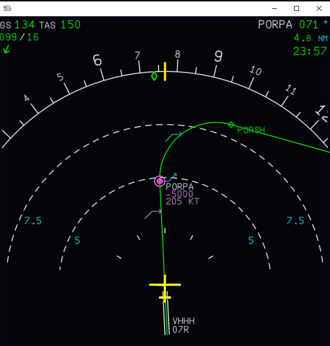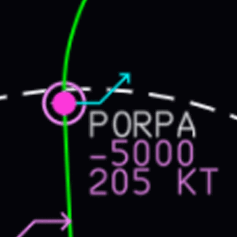 • The magenta outer ring reaffirms there is a constraint at PORPA but additionally signifies the ALT CSTR will be met, and the aircraft will cross at or below 5000 ft.