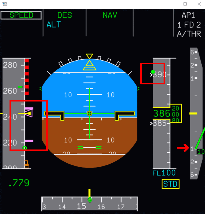 2. The V/DEV or "yoyo" indicator. It provides a visual indicator of how far below the descent profile from the command altitude (FL100). In this case, you will notice the aircraft is far below the profile, in part due to starting the descent early.