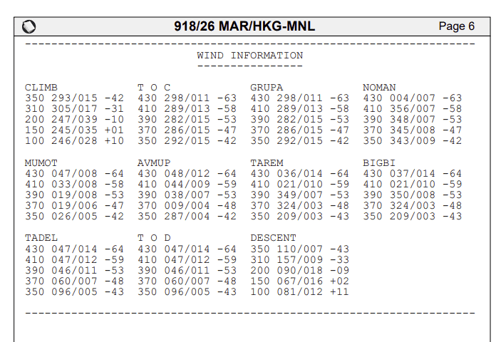 The winds page accepts the following format: HDG / SPEED / ALTITUDE.