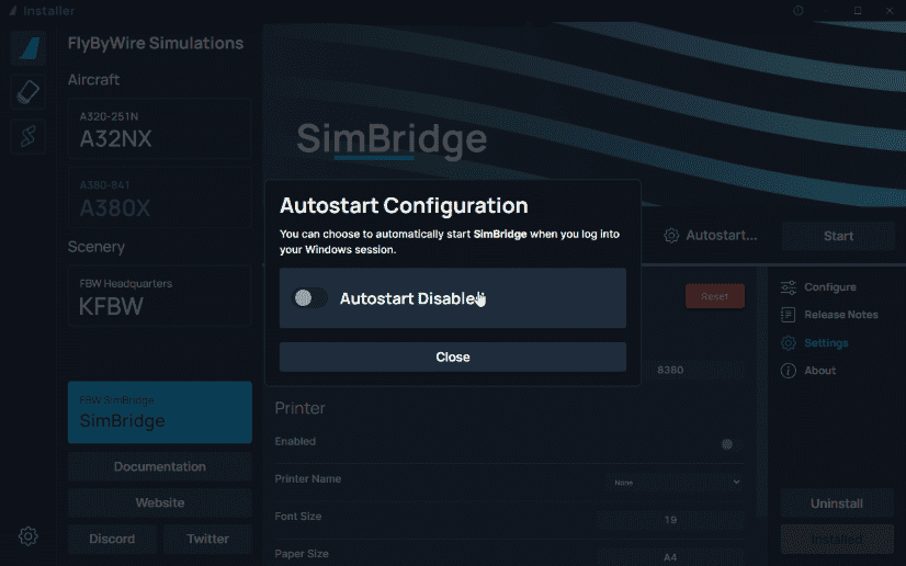Autostart is a feature provided by the FlyByWire Installer that allows SimBridge to be autostarted upon Windows start. SimBridge will live in the system tray, similar to Navigraph Simlink.