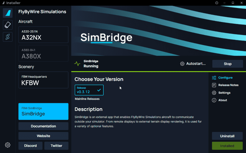 If you choose not to enable autostart, you can open SimBridge via the installer. Just select the Start button. SimBridge running
